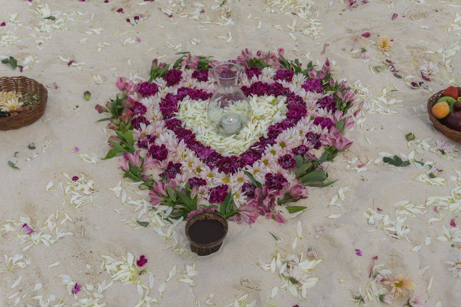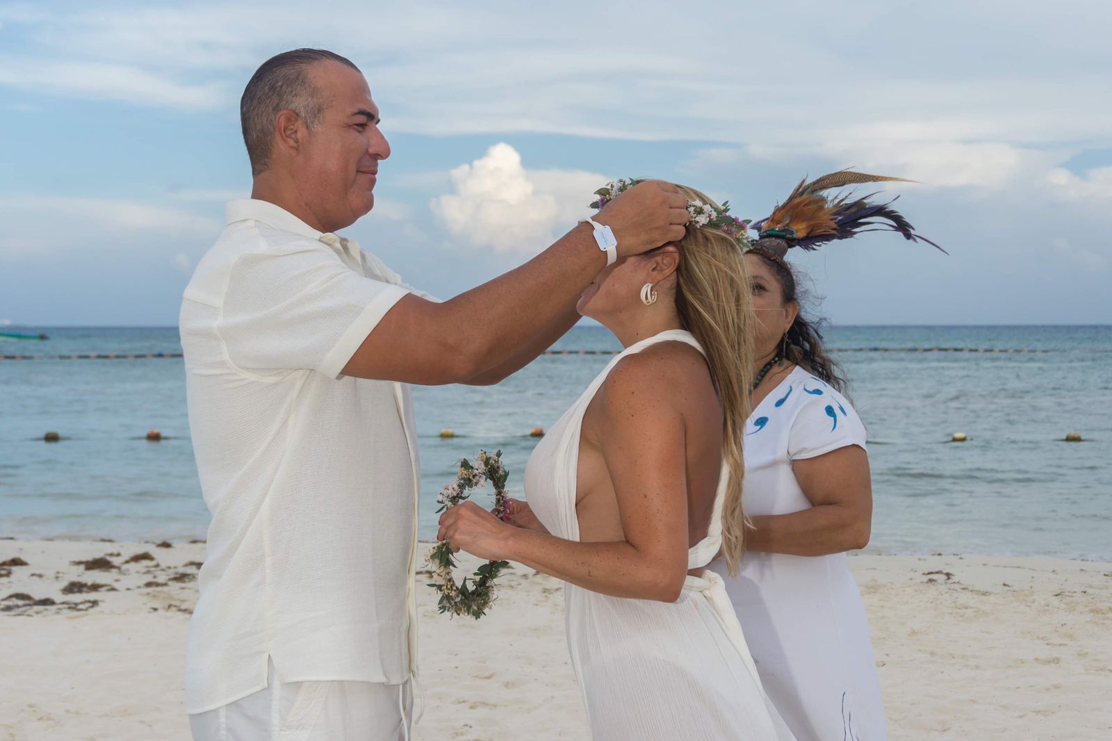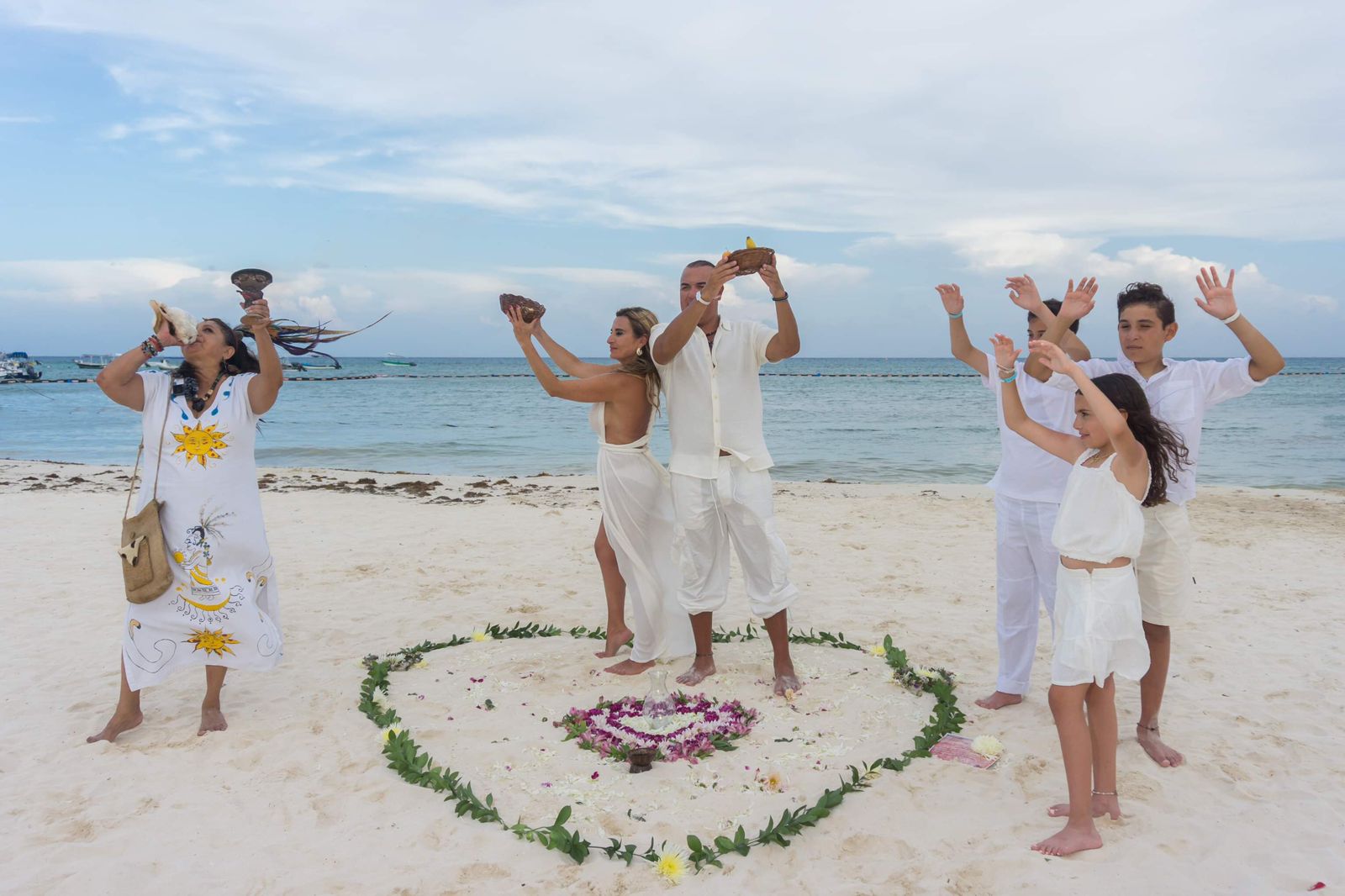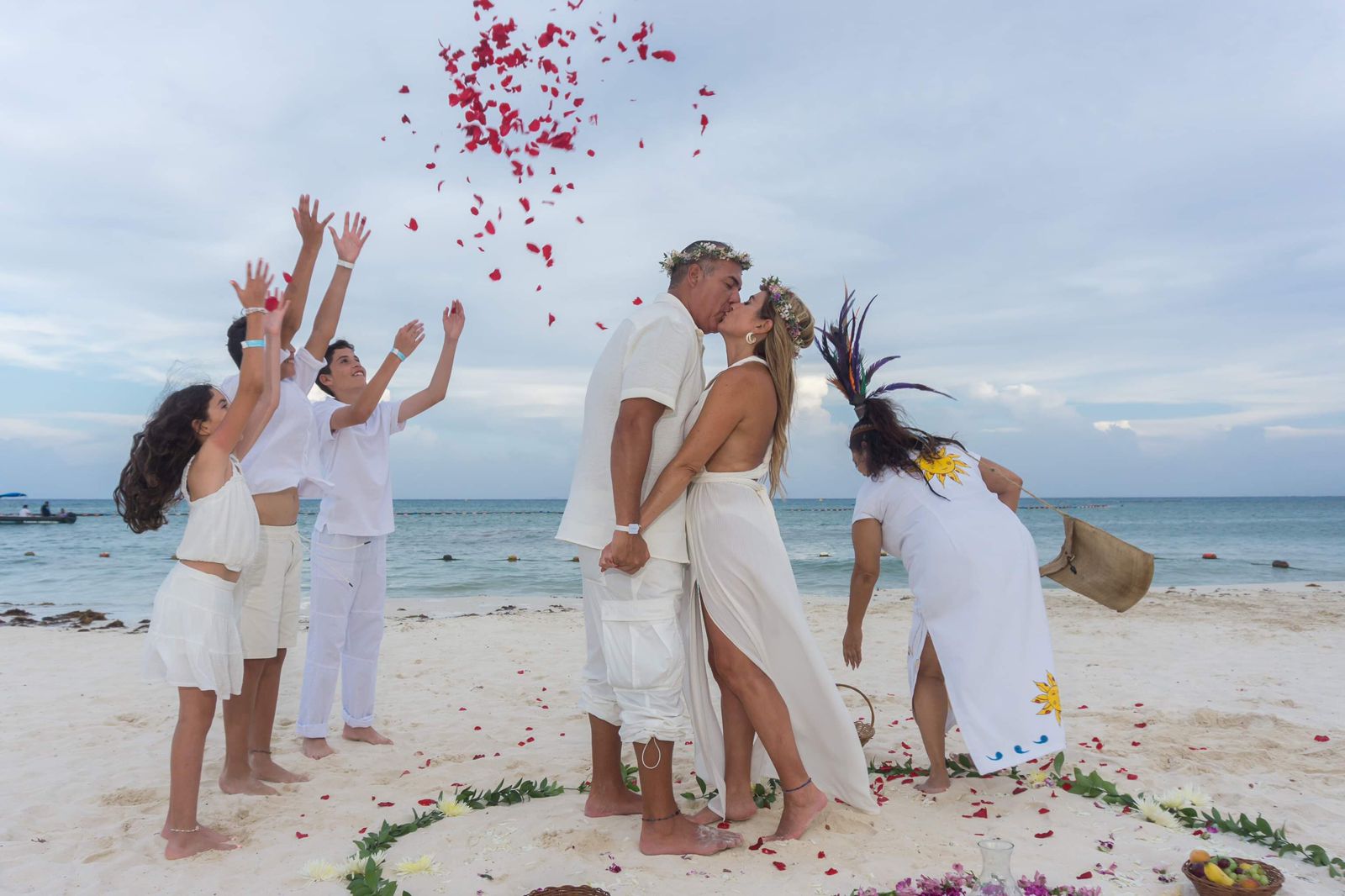 🌺 Mayan Ceremony A spiritual ritual that connects with the energy of the 4 elements and the blessing of the Mayan Gods. The ritual includes: 🌸 Altar with flowers 🍇 Basket with fruits 🌾 Basket with seeds 👑 Two flower wreaths 🥥 A gourd with Bal’ché, the sacred drink of the Mayans 🎶 Live music with pre-Hispanic instruments 🔥 Ceremony Flow 1. We ask permission from the guardians of the place, invoking the Mayan Gods. 2. The altar, representing the 4 elements, symbolizes abundance and harmony. 3. The couple exchanges vows and feeds one another with fruit, representing physical and spiritual union. 4. They share Bal’ché, the sacred drink made from tree bark. 5. They are blessed with seeds, symbolizing abundance and a prosperous future. 6. Finally, guests shower the couple with flower petals, wishing them a happy and lasting life.