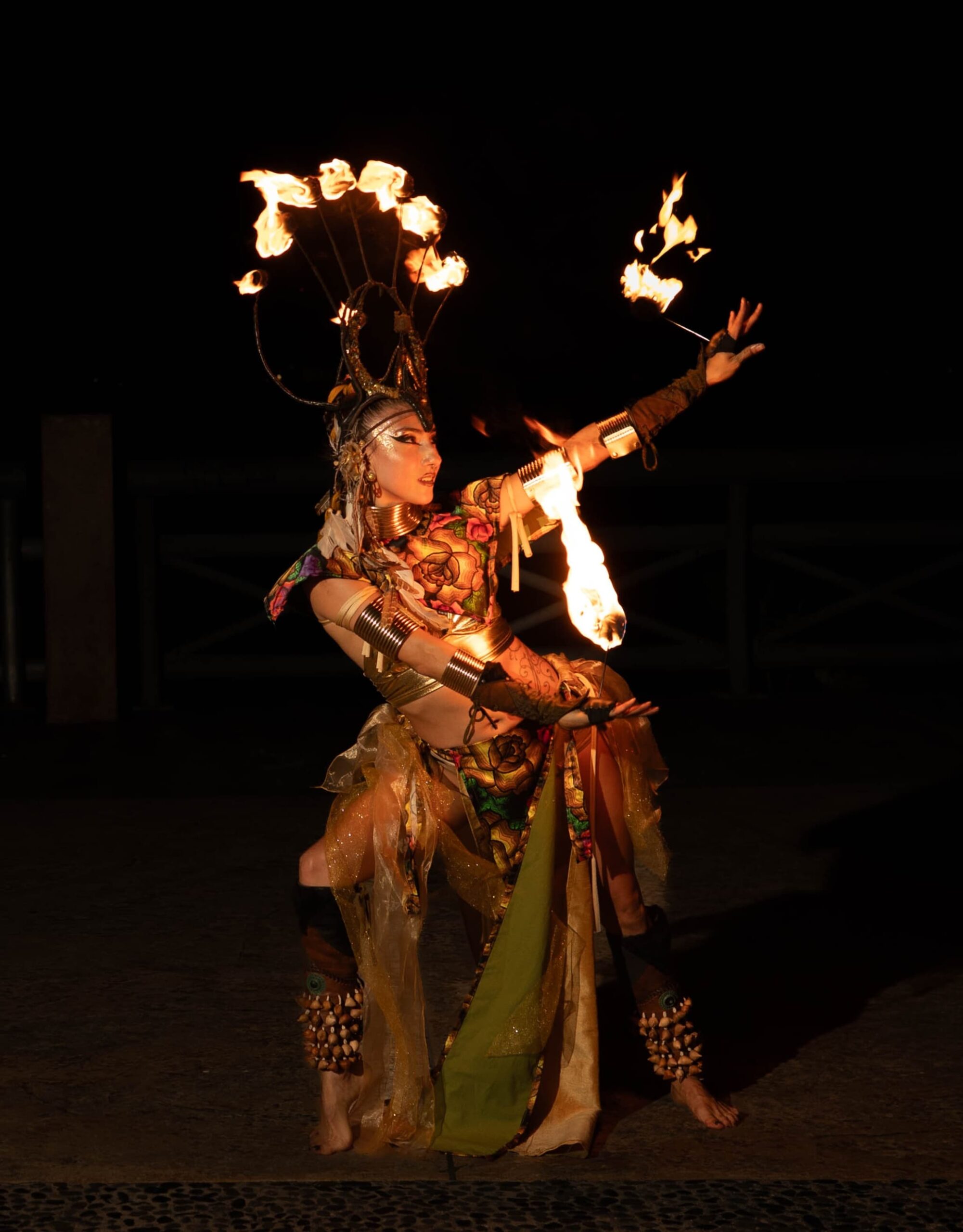 Our team of four professional fire artists delivers a 20-minute choreographed performance filled with dynamic movement, lights, and visual effects. The show features fire juggling, torches, fire staffs, and controlled pyrotechnics, all performed with the highest safety standards.